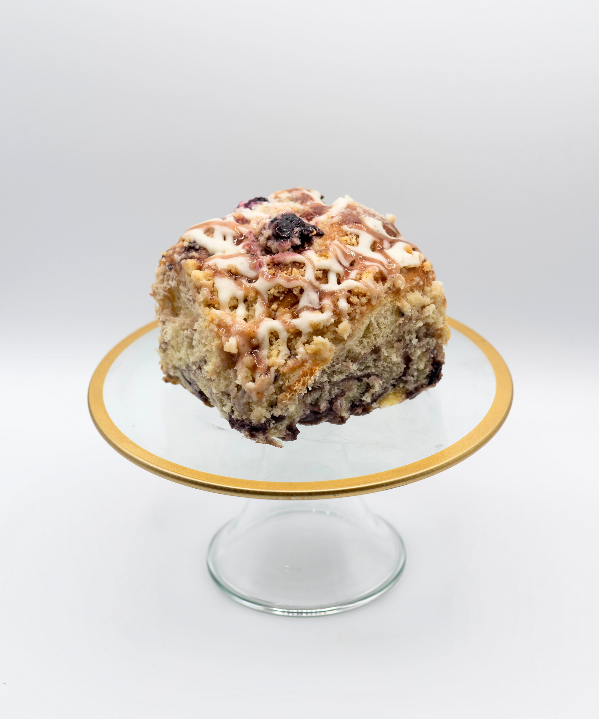 These Blueberry swirls bring the flavor of blueberry to new heights! The filling is a mix of cream cheese and real blueberry fillings. But that's not the end! Before it's rolled up, we give it a soft dusting of homemade blueberry muffin crumble. The topping is more muffin crumble and drizzled with cream cheese frosting.